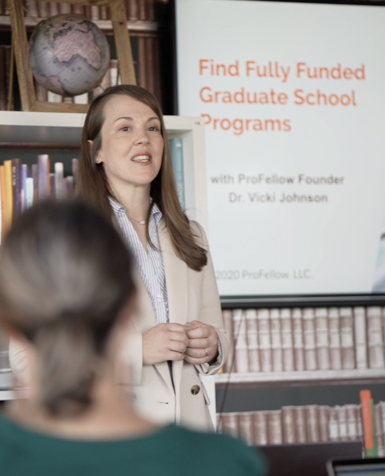 Dr. Vicki Johnson is Founder and Director of ProFellow, the world’s leading online resource for professional and academic fellowships. She is a four-time fellow, top Ph.D. scholar, and an award-winning social entrepreneur. She is the creator of the Fully Funded Course and Mentorship Program, which has helped hundreds of students achieve entrance to top graduate schools with funding awards totalling more than $30 Million since 2019.